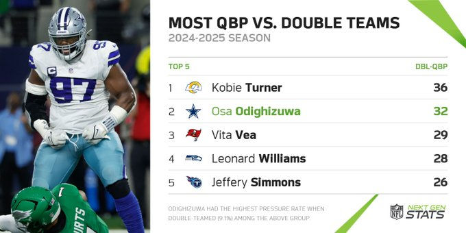 עדכון: כמה מהלכים משמעותיים נוספים של הניינרס בהמשך השבוע - דרה גרינלו, שנחתך מהברונקוס, חזר לקבוצתו הישנה. ברייס האף פרש בגיל 27 ממשחק, אבל הקבוצה הוסיפה למרכז קו ההגנה את אוסה אודיגיזוואה (טרייד תמורת בחירת סיבוב 3 שהלכה לדאלאס). אני חושב שאודיגיזוואה הוא שחקן די אנדרייטד ואחד הפאס-ראשרים הכי טובים בעמדה בליגה. בין היתר, הוא דורג ב-2025 במקום השישי ביצירת לחצים מכל ה-DTs בליגה (134 בסך הכול), שני ב-QB Hits, ומקום 19 ב-Hurries. בשנתיים האחרונות, הוא דורג שני בליגה ביצירת לחצים מול דאבל-טים: